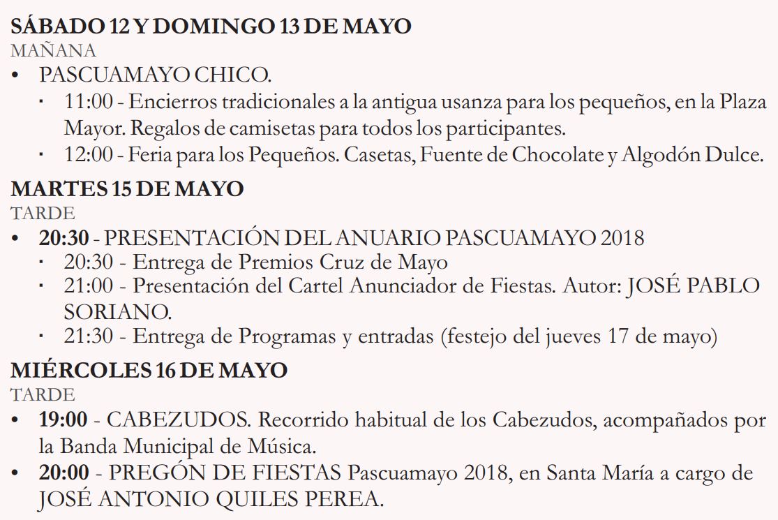 PROGRAMACIÓN OFICIAL DE LAS FIESTAS DE PASCUAMAYO 2018, SATISTEBAN DEL PUERTO.