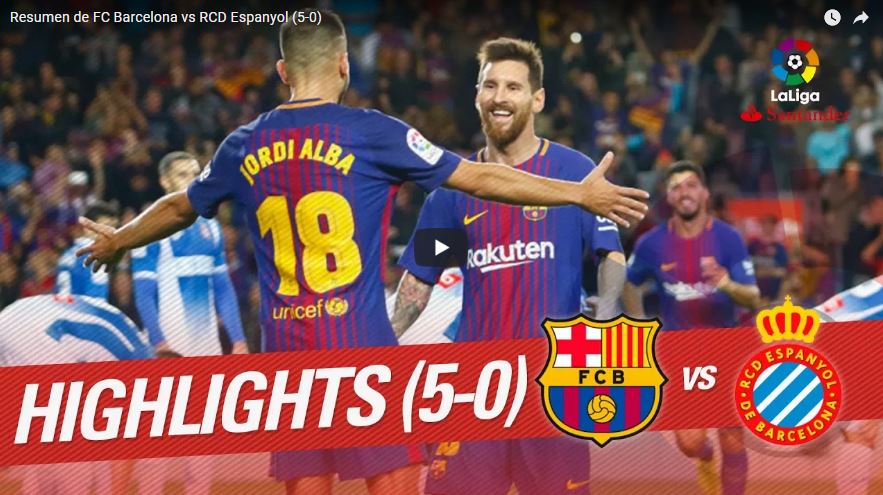 Con un hat-trick de Messi y los goles de Piqué y Luis Suárez el FC Barcelona gana el derbi contra el RCD Espanyol.